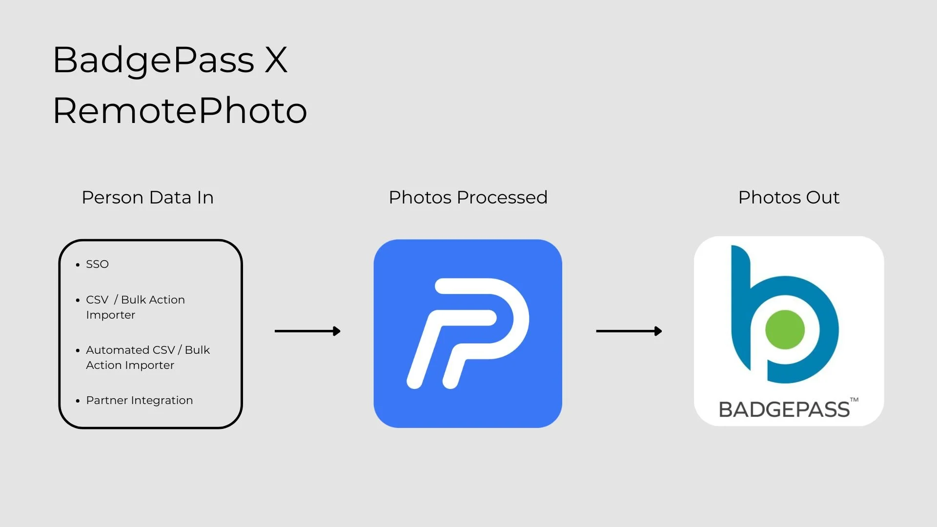 Person data is uploaded into RemotePhoto via SSO credentials, a CSV bulk-action import (manual or automated), or via a separate partner integration to create users and send automated photo requests. RemotePhoto processes and approves the photos, then provides a seamless hand-off by automatically exporting the high-quality images directly into your BadgePass system, eliminating the need for manual uploads and streamlining your badge printing process.