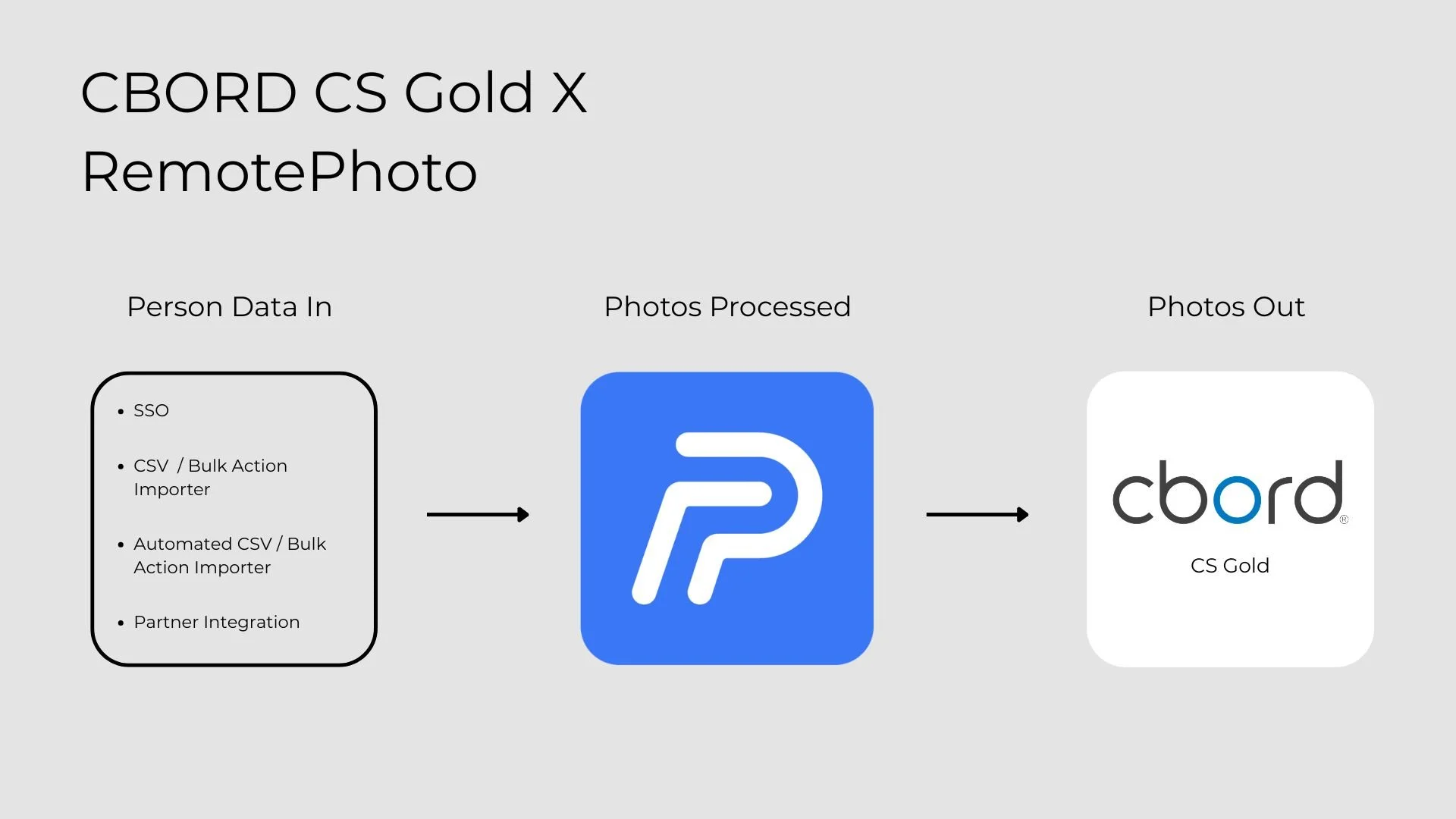 RemotePhoto ingests person records via SSO credentials, bulk CSV actions (manual or automated), or partner-specific integrations to create users and send automated photo requests. After photo upload, processing, and approval, RemotePhoto provides a seamless hand-off by automatically exporting high-quality images directly into CBORD CS Gold.