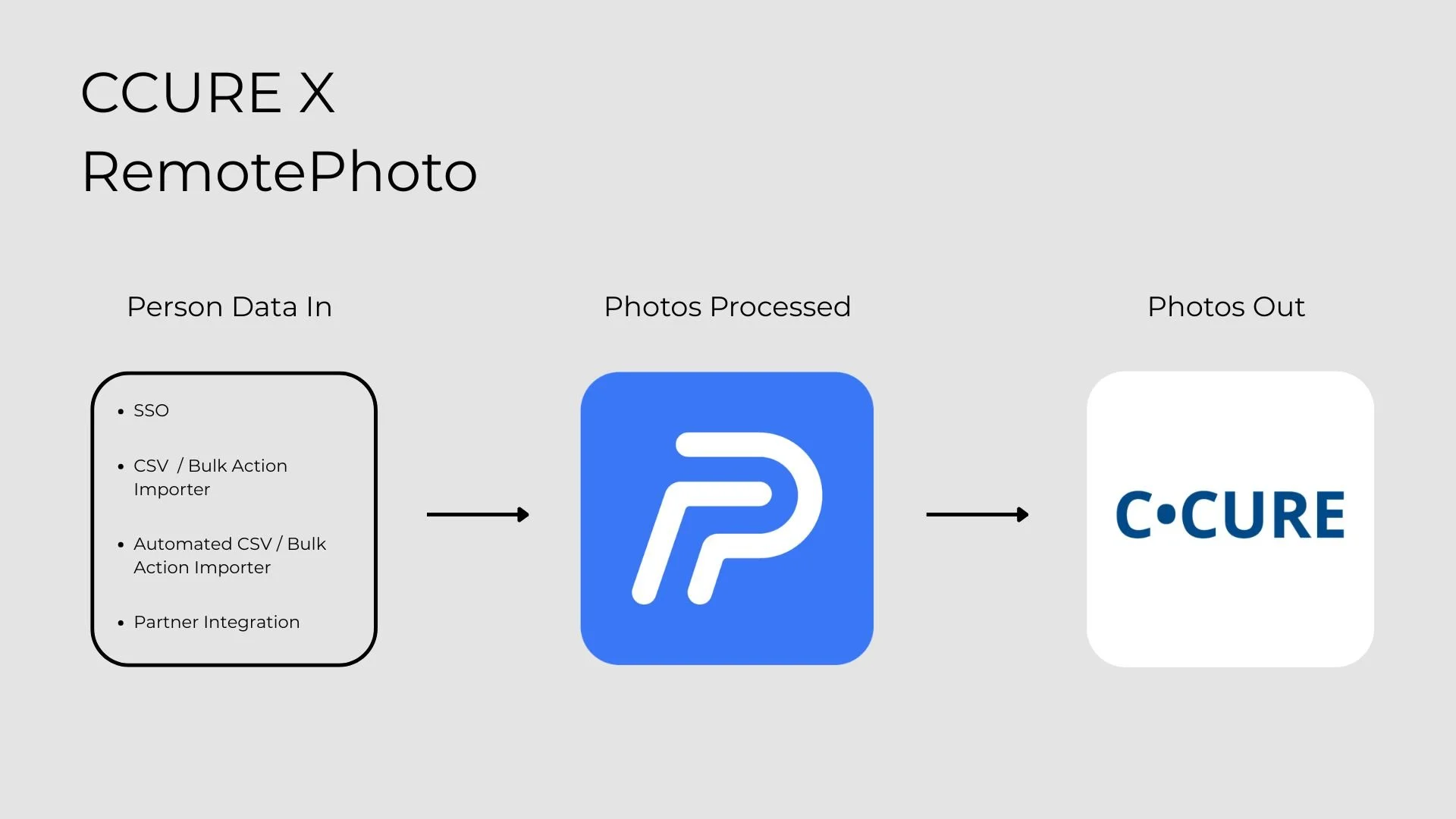 Person data is ingested into RemotePhoto via SSO credentials, a CSV bulk-action import (manual or automated), or via a separate partner integration to trigger automated user creation and photo submission requests. Once the user submits their photo in RemotePhoto and it passes approval, the high-quality image is automatically exported directly into your CCURE 9000 system, eliminating manual entry and ensuring your security database is always up to date.