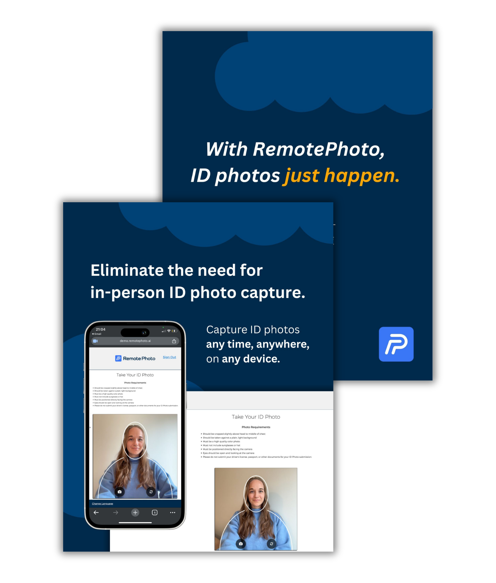Gather perfectly compliant, high-quality ID photos without ever scheduling an in-person photo appointment. RemotePhoto simplifies the entire photo capture process through a self-service remote workflow designed for any device.